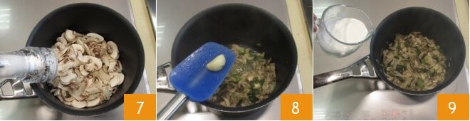 cocina durante otros 3 minutos y añade sal 7. Luego retira el ajo 8 y vierte la nata 9.