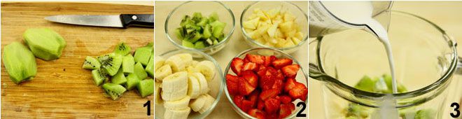 Para preparar el batido de frutas, comenzad pelando el kiwi, luego cortadlo en cubos eliminando la parte blanca central 1. Lavad los melocotones, peladlos y cortadlos en cubos. Lavad las fresas, eliminad el tallo verde y cortadlas por la mitad. Finalmente, pelad los plátanos y cortadlos en rodajas 2. Poned toda la fruta en el vaso de una batidora y añadid la leche. Batid todo hasta obtener una mezcla lisa y homogénea. ¡Servid de inmediato!