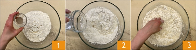 Para preparar el battilocchio napolitano, verted la harina y la levadura en un bol grande 1, luego mezclad con la mano. Añadid una parte del agua 2 y amalgamad de nuevo para absorberla completamente 3. Verted el agua restante poco a poco, continuando a amasar con la mano hasta obtener una masa homogénea.