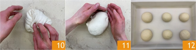 Tomad una porción de masa a la vez y estirad los bordes desde el exterior hacia el interior 10, luego formad bolas sobre la superficie de trabajo 11 y colocadlas en una caja para la fermentación 12. Cerrad con la tapa y dejad que suban durante unas 6-8 horas a una temperatura de aproximadamente 18°-24°.