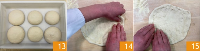 Pasado el tiempo de fermentación, las bolas habrán duplicado su volumen 13. Extendiendo la primera bola de masa suavemente con las manos 14, luego aplastad la masa con los dedos para formar un disco de aproximadamente 18 cm de diámetro, asegurándoos de no hacer demasiado fino el centro 15.