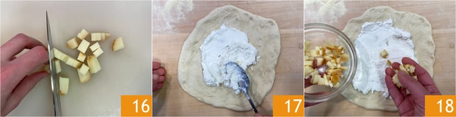 Proceded de esta manera para extender todas las bolas de masa, luego pasad al relleno: cortad la provola en cubos 16, luego suavizad la ricotta con un poco de leche y extendida sobre la superficie, dejando los bordes libres 17. Distribuid los cubos de provola 18.