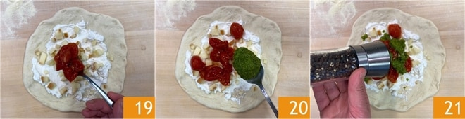 Añadid la salsa de tomates 19 y el pesto 20. Finalmente, sazonad con un poco de pimienta molida 21.