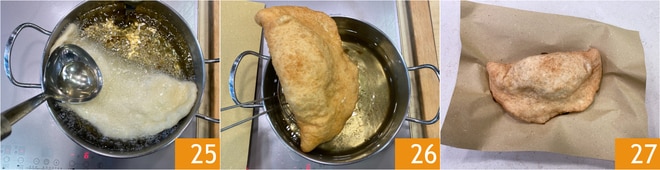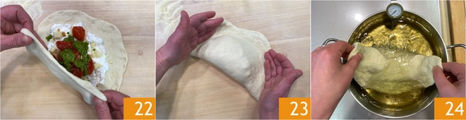 Doblaz la masa por la mitad 22 para formar una media luna, luego apretad bien alrededor del relleno para eliminar todo el aire 23. Cuando hayáis rellenado todos los calzones, estaréis listos para freír: en una olla grande, calentad el aceite de semillas a una temperatura de 180°, luego sumergid delicadamente el calzone 24.