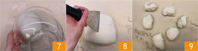 Cuando la masa esté lisa, uniforme y compacta, formad una bola, cubrid con el bol 7 y dejad reposar a temperatura ambiente durante 5 minutos. Pasado este tiempo, dad algunos pliegues más, luego cubrid nuevamente la masa con el bol y dejad reposar durante otros 30 minutos. Pasado el tiempo de reposo, dividid la masa con una espátula 8 en 6 porciones de aproximadamente 280 g cada una 9.