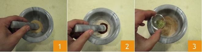 Para preparar el beer can chicken al horno comenzad con la preparación del Caldo de carne, y luego proceded a realizar el rub. Insertad en el mortero el azúcar moreno 1, y empezad a machacar con el mazo del mortero. Cuando hayáis obtenido un polvo fino, añadid el pimentón 2 y machacad nuevamente. Agregad también el orégano y machacad 3.