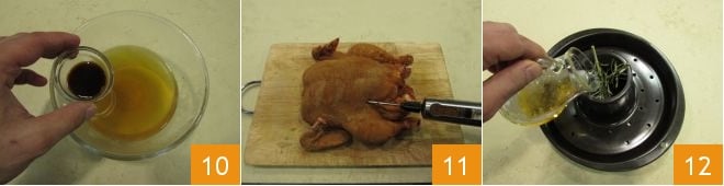 Para las inyecciones: tomad el caldo de carne preparado previamente y enfriado, añadid la salsa Worcestershire, extraed el líquido con una jeringa de carne e inyectadlo en la musculatura del pollo 11, extrayendo la jeringa mientras insertáis el líquido. Este movimiento permite una mejor difusión de los líquidos en el interior. Durante la inyección se verán inflar los tejidos, indicativo de una correcta infiltración de los líquidos. Una gran parte se perderá de todos modos, pero se obtendrá como resultado una carne muy húmeda y jugosa. Verted la cerveza en la parte central de la bandeja adecuada para la cocción del pollo con la lata, y añadid una ramita de romero 12.