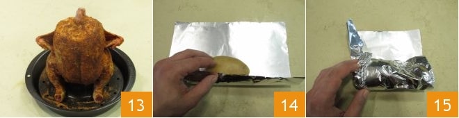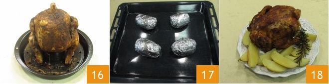 Colocad el pollo en el soporte 13 y hornead en horno estático precalentado a 195°C durante unos 45/50 minutos. Un acompañamiento rápido puede hacerse con patatas al papillote. Lavád bien las patatas, y sin quitar la piel envolvedlas en aluminio (14-15), luego colocadlas en una segunda bandeja para insertar en el plano más bajo del horno. Coced junto al pollo durante el mismo tiempo y a la misma temperatura.