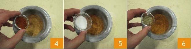 Unid el chile 4, la sal 5 y la pimienta 6, continuando a machacar. Todo deberá resultar muy fino.