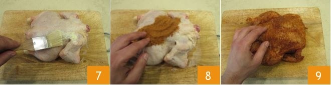 Mojad un pincel en la mantequilla derretida y rociad ligeramente el pollo en cada parte 7. Comenzad luego a esparcir el rub por toda la superficie 8, tanto externa como interna del pollo, y masajead bien con las manos para que los aromas penetren en las fibras para dar sabor a la carne 9. Envolved el pollo en plástico y dejadlo reposar en el frigorífico por al menos un par de horas.