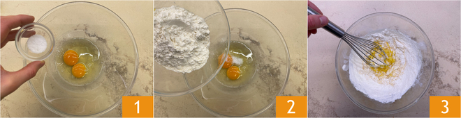 Para preparar los benderniki, comienza con la masa de los crepes: rompe los huevos en un bol, luego añade la sal 1, la harina 2 y mezcla con la batidora 3.