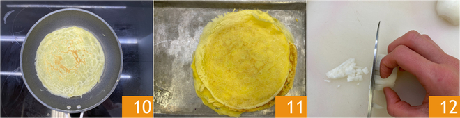 Continúa la cocción por el otro lado durante 1-2 minutos más 10. Apila las crepes a medida que estén cocinadas; con estas cantidades obtendrás 6 11. Reserva y pasa al relleno: limpia y pica finamente la cebolla 12.
