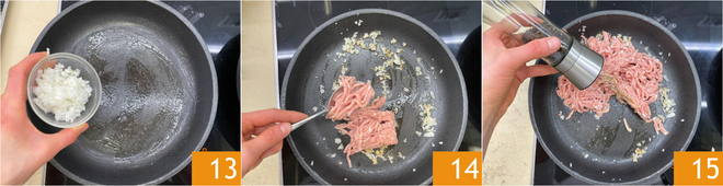 Derrite la mantequilla en una sartén, añade la cebolla y sofríela durante un par de minutos 13. Añade la carne picada 14, salpimenta al gusto 15.