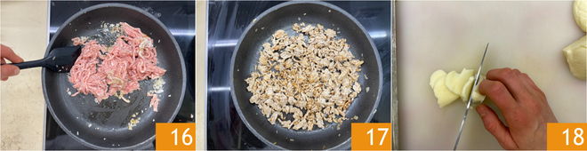 Cocina a fuego medio durante unos diez minutos, desmenuzando la carne con una cuchara 16 hasta que esté bien cocida 17. En este punto, corta el queso en rodajas finas 18.