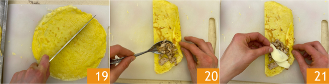 Estás listo para ensamblar los benderniki: divide las crepes por la mitad 19, luego coloca una cucharada de relleno en el extremo de una media crepe 20 y coloca encima el queso 21.