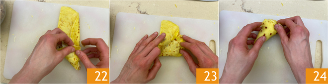 Dobla el extremo de la crepe sobre el relleno para formar un triángulo 22 y continúa doblando todo de esta manera hasta llegar al otro extremo 23. Finalmente, inserta los bordes hacia dentro para sellar el paquetito 24. Repite el procedimiento para formar en total 12 benderniki.