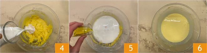 Añade la leche 4 y el aceite 5 y mezcla de nuevo hasta obtener una masa lisa y sin grumos 6.