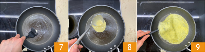 Unta con mantequilla una sartén antiadherente de 20-22 cm 7 y, una vez caliente, vierte en el centro un cucharón de masa 8. Cocina a fuego medio durante 1-2 minutos; cuando los bordes comiencen a levantarse, da la vuelta al crepe con una espátula 9.