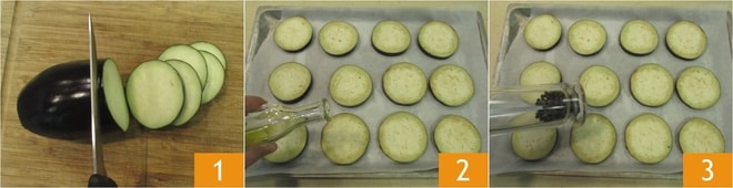 Para preparar las berenjenas gratinadas, primero lava las berenjenas y córtalas en rodajas de aproximadamente 1 cm de grosor 1. Coloca las rodajas de berenjena en una bandeja forrada con papel de horno y sazona con aceite 2, sal y pimienta 3. Cocina en horno ventilado precalentado a 200° durante 20 minutos.