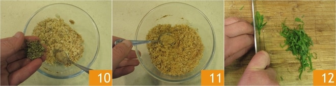 Finalmente, aromatiza con el orégano 10 y mezcla para integrar el compuesto 11. Pica finamente la menta fresca 12.