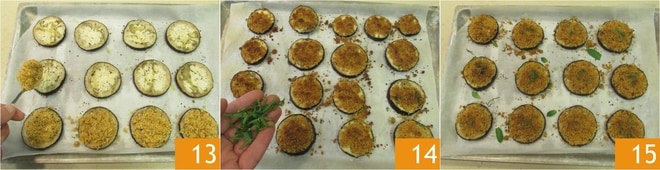 Pasado el tiempo de cocción, saca las berenjenas del horno y distribuye el empanado sobre cada rodaja 13. Hornea nuevamente durante 3 minutos encendiendo el grill a 240°, después adorna con la menta picada 14. ¡Tus berenjenas gratinadas están listas para ser servidas 15!