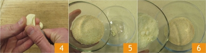 Mientras tanto, prepara el empanado: quita el corazón del diente de ajo 4, luego pícalo o aplástalo dentro de un bol. Agrega el pan rallado 5 y el Parmesano rallado 6.