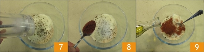 Añade la sal 7, el pimentón 8 y el aceite 9.