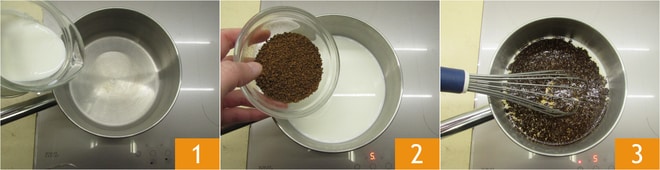 Para preparar vuestra bizcochada caliente al café, empezad poniendo la leche en un cazo a fuego medio 1. Cuando esté caliente, añadid el Nescafé y disolvedlo bien 2, mezclando con la varilla 3.