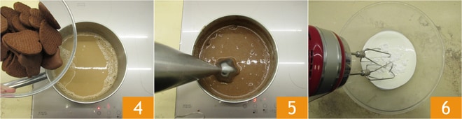 En este punto, verted las galletas 4 y dejadlas disolver mientras seguís mezclando. Una vez integradas, utilizad la batidora de mano para triturar la mezcla, así no quedarán grumos 5. Reservad la bizcochada y preparad la nata: en un bol verted la nata fría y añadid el azúcar glas, montad con las varillas eléctricas 6.