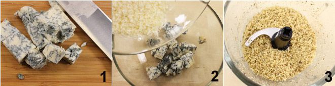 Para preparar las galletas al gorgonzola, comienza cortando el gorgonzola picante en pequeños cubos 1 (puedes utilizar también el queso roquefort), luego colócalo en un bol y añade el parmesano rallado 2. Tritura finamente las nueces y resérvalas 3.
