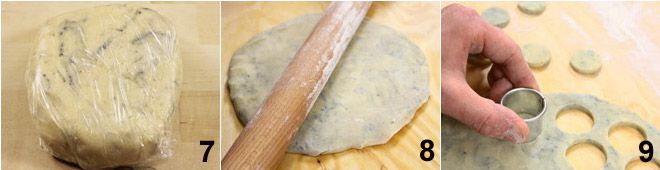 forma con la masa un bloque, cúbrelo con papel film y colócalo en el frigorífico durante aproximadamente media hora 8. Pasado el tiempo de reposo, extiende el bloque con el rodillo sobre una superficie enharinada formando una lámina de aproximadamente 1 cm de grosor 8, ahora con la ayuda de un cortador redondo de aproximadamente 3 cm de diámetro, corta las galletas 9 y colócalas en una bandeja forrada con papel de horno. Pinta la superficie de las galletas con nata y cúbrelas con las nueces trituradas y las semillas de sésamo. Finalmente, hornea en el horno precalentado a 180 grados durante unos 20 minutos. Saca las galletas del horno y déjalas enfriar sobre una rejilla.