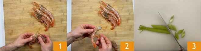 Para preparar la bisque, como primer paso prepara el Caldo de mariscos siguiendo nuestra receta. Limpia las gambas. Utilizando las manos, retira con cuidado la cabeza 1, las patas 2 y el caparazón. Reúne todos los desechos en un bol; para esta preparación necesitarás aproximadamente 500 g. Para hacer la bisque no son necesarias todas las gambas que limpies, bastarán 3-4 por persona, podrás utilizar las otras para tus recetas. Luego prepara el sofrito, limpia bien el apio y córtalo en tiras 3.