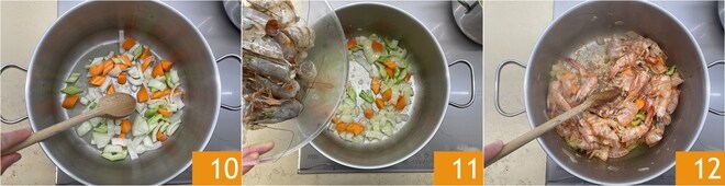 Mezcla para sazonar 10, luego añade los desechos de los caparazones 11 y sube el fuego. Mezcla de vez en cuando, deberá formarse una costra en el fondo 12.