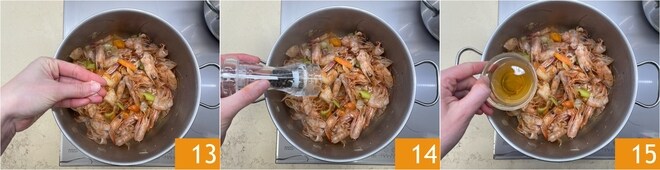 Añade sal 13, pimienta 14 y rocía con el coñac 15.
