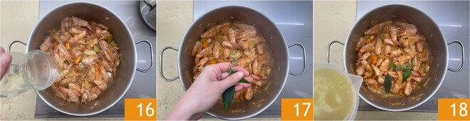 Luego vierte también el vino blanco 16 y deja evaporar completamente la parte alcohólica durante unos minutos. Añade las hierbas aromáticas 17 y vierte el fumet de pescado 18.