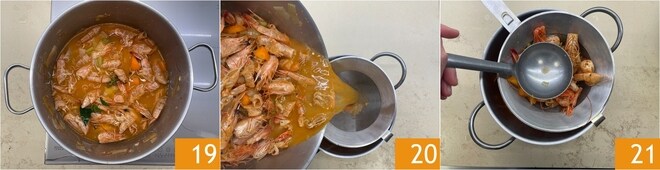 Deja cocinar a fuego medio durante unos 30 minutos 19, mezclando de vez en cuando. Una vez listo, filtra en otra olla con un colador chino de malla fina 20, presionando bien las cabezas con un cucharón para que salga todo el jugo 21.