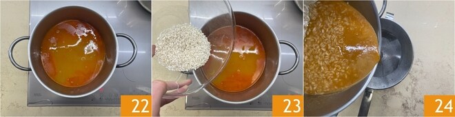 Ponlo nuevamente en el fuego 22 y lleva a ebullición. Vierte el arroz en el interior 23 y cocina durante unos 15 minutos, mezclando de vez en cuando. De esta manera, el arroz liberará todo su almidón dentro de la bisque. Filtra nuevamente la bisque con un colador chino de malla fina 24, en otra olla.