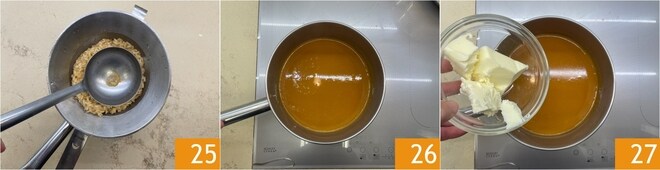 Presiona bien con el dorso de un cucharón 25 y vuelve a poner la bisque en el fuego 26. Añade los 100 g de mantequilla restantes 27.