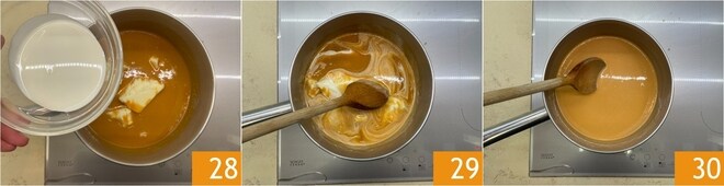 Añade también la nata 28 y mezcla 29 hasta que estén bien integrados 30. Si es necesario, ajusta de sal y pimienta.
