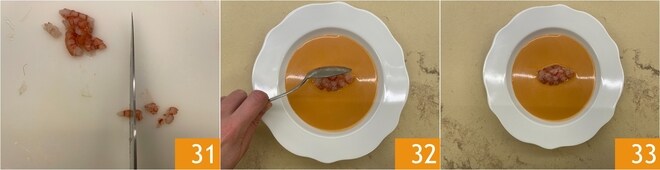 Corta las gambas en pequeños trozos 31. Sirve la bisque añadiendo una quenelle de gambas encima 32 y disfrútala caliente 33!