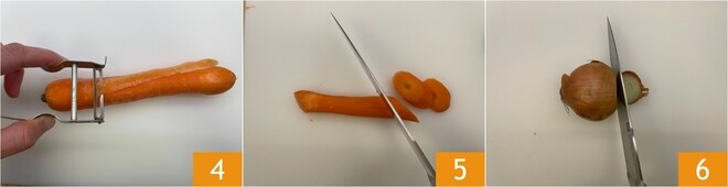 Pela la zanahoria 4 y córtala del mismo tamaño que el apio 5. Pela también la cebolla 6.