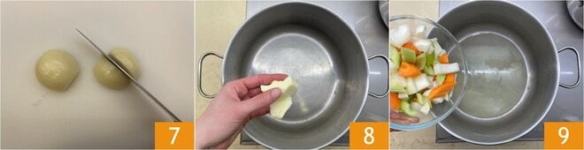 Corta también la cebolla en trozos grandes 7. Luego toma una olla grande y añade 20 g de mantequilla en su interior 8; déjala derretir y añade también las verduras del sofrito 9.