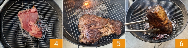 Luego colocadla en el centro de la parrilla 4 y cocinadla 8 minutos por cada lado. Al darle la vuelta, las líneas de la parrilla deben ser bien visibles 5. Una vez terminada la cocción también del otro lado, colocad nuevamente la carne en vertical, al lado de la parrilla siempre sobre la parte del hueso. De este modo, al descansar, los jugos se estabilizan y la carne resultará más tierna. Tened cuidado de no quemar demasiado el hueso.
