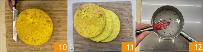 Una vez desmoldado y enfriado, se procederá a eliminar las imperfecciones en la superficie 10, luego a dividir en 3 discos 11. Preparad el almíbar mezclando en un cazo el agua, el azúcar y las semillas de la vaina 12, mezclad y llevad a ebullición, luego apagad y dejad enfriar.
