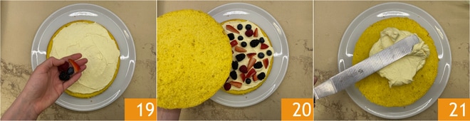 Disponed una capa de frutos del bosque 19, luego otro bizcocho 20, almíbar y crema 21.