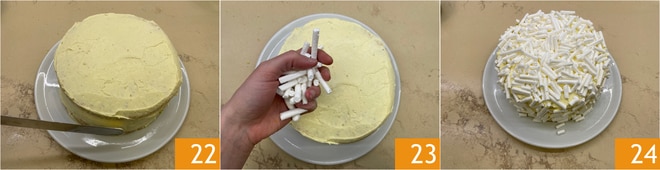 Terminad distribuyendo toda la crema también alrededor del dulce 22. Dejad que repose en la nevera durante 30 minutos. Decorad con merengues 23 y azúcar glas. ¡Vuestro bizcocho con chantilly y frutos del bosque está listo para ser servido 24!