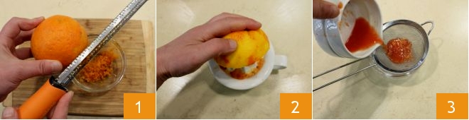 Para preparar el plumcake al aceite empezad rallando la cáscara de las naranjas 1, luego exprimid 100 ml de zumo y filtradlo con un colador (2-3).