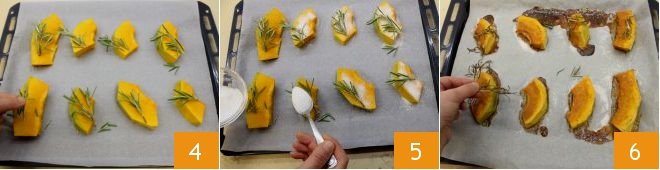 Colocadlas en una bandeja cubierta con papel de horno y poned en cada rodaja algunas agujas de romero 4, luego espolvoread con el azúcar granulada 5, y coced en horno estático precalentado a 180° durante 60 minutos (a 160° durante unos 50 minutos si el horno es ventilado). Cuando la calabaza esté lista, ligeramente tostada y ablandada, eliminad las ramitas de romero 6,