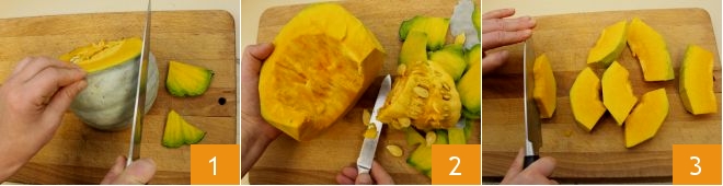 Para preparar el bizcocho de calabaza, comenzad sacando la pulpa eliminando con un cuchillo afilado la parte exterior 1, luego quitad las semillas 2 y cortad la calabaza en rodajas no demasiado finas 3.