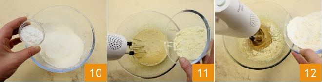 En otro bol pequeño tamizad la harina 00 y añadid la levadura 10. Luego añadid al compuesto de huevos y azúcar la harina de almendra 11, luego la harina 00 a la que habéis añadido la levadura 12.